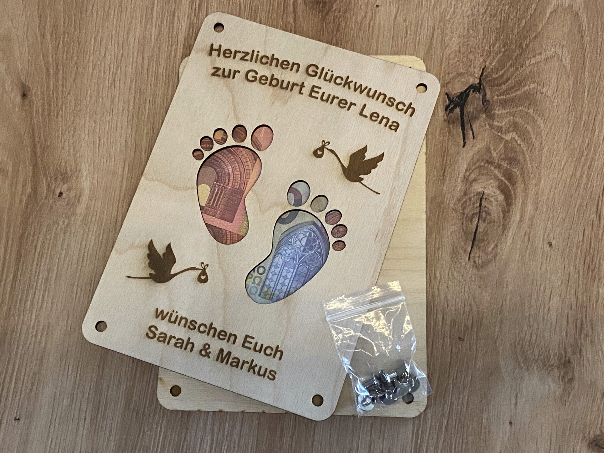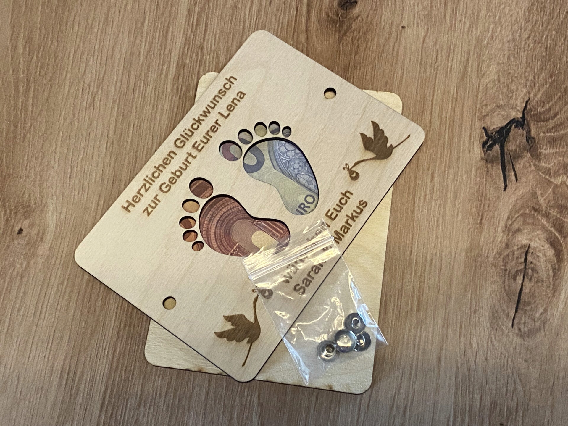 Mit dieser liebevoll gestalteten Geschenkkarte aus Holz als Geldgeschenk liegen Sie zur Geburt immer goldrichtig. Persönlich, zeitlos und eine wunderschöne Erinnerung an einen ganz besonderen Moment.